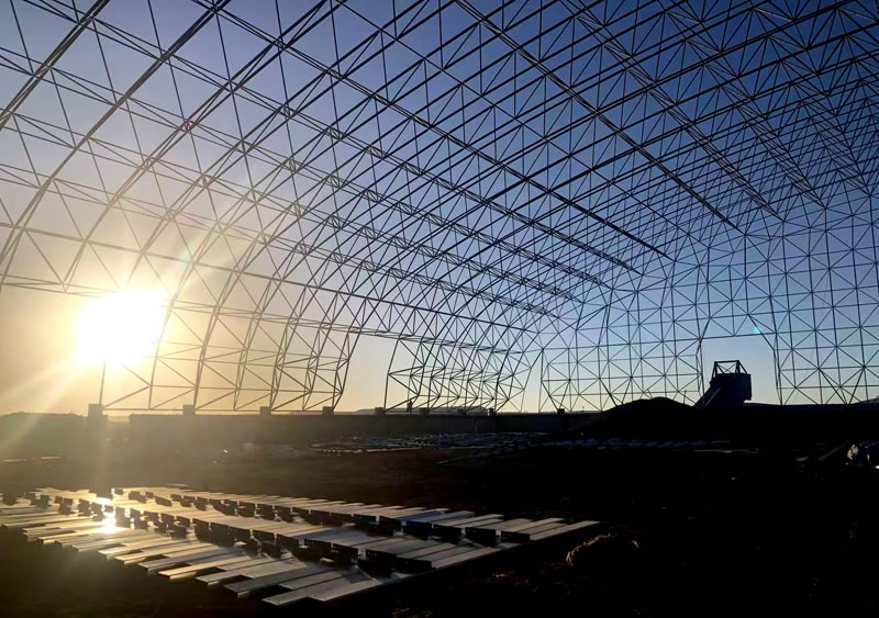 3、材料:正放四角錐螺栓球節(jié)點網(wǎng)架,按照甲方確認(rèn)的圖紙設(shè)計要求加工制作。網(wǎng)架主材材質(zhì)為Q355B鋼管,底漆二道70um,主檁條鍍鋅C型鋼C220*75*20*3.0,次檁條鍍鋅C型鋼C180*70*20*2.5,屋面板0.5mm厚彩鋼單板